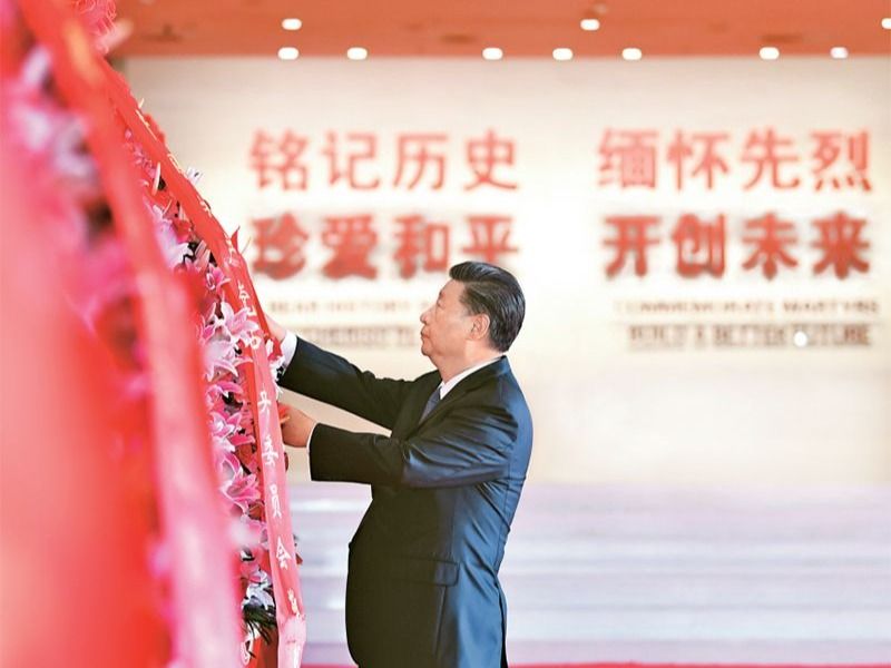 2020年9月3日上午,中共中央总书记、国家主席、中央军委主席习近平等党和国家领导人来到中国人民抗日战争纪念馆,出席纪念中国人民抗日战争暨世界反法西斯战争胜利75周年向抗战烈士敬献花篮仪式。这是习近平整理花篮上的缎带。