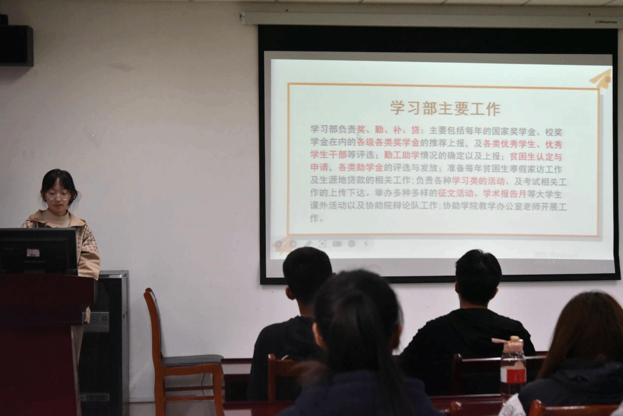 在思想政治引领和组织建设两个层面,团学部亓子扬与学风建设中心的多位负责人分别就各自领域的工作及对接团干部的方式进行了详细阐述。亓子扬从作风建设角度出发,强调团干部需铭记职责,坚持服务初心,完善智慧团建工作,确保思想政治引领紧密联系青年。学风建设中心方面,殷朝阳代表纪检部,督促团干部配合学院日常查课、查迟到工作,规范学习生活;宿管部梁艺馨指出团干部应带头确保宿舍卫生整洁,培养良好生活习惯;学习部袁心瑜则提醒团干部工作时需遵循文件要求,确保公平公正,保障组织稳定发展。这些举措旨在帮助新生团干部明确工作流程,更好地服务于学生和学院。