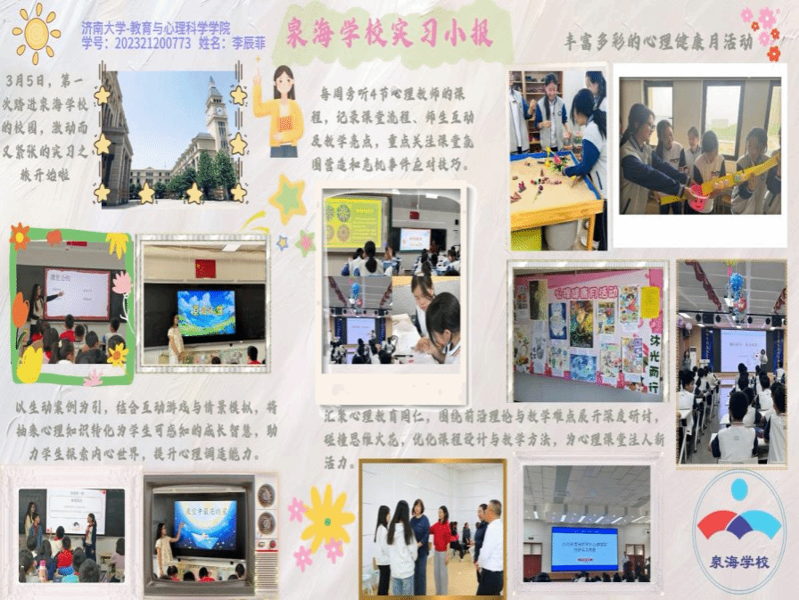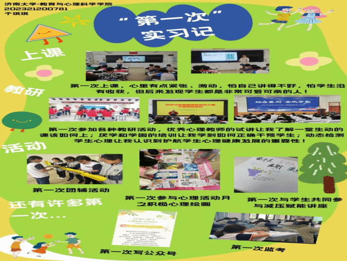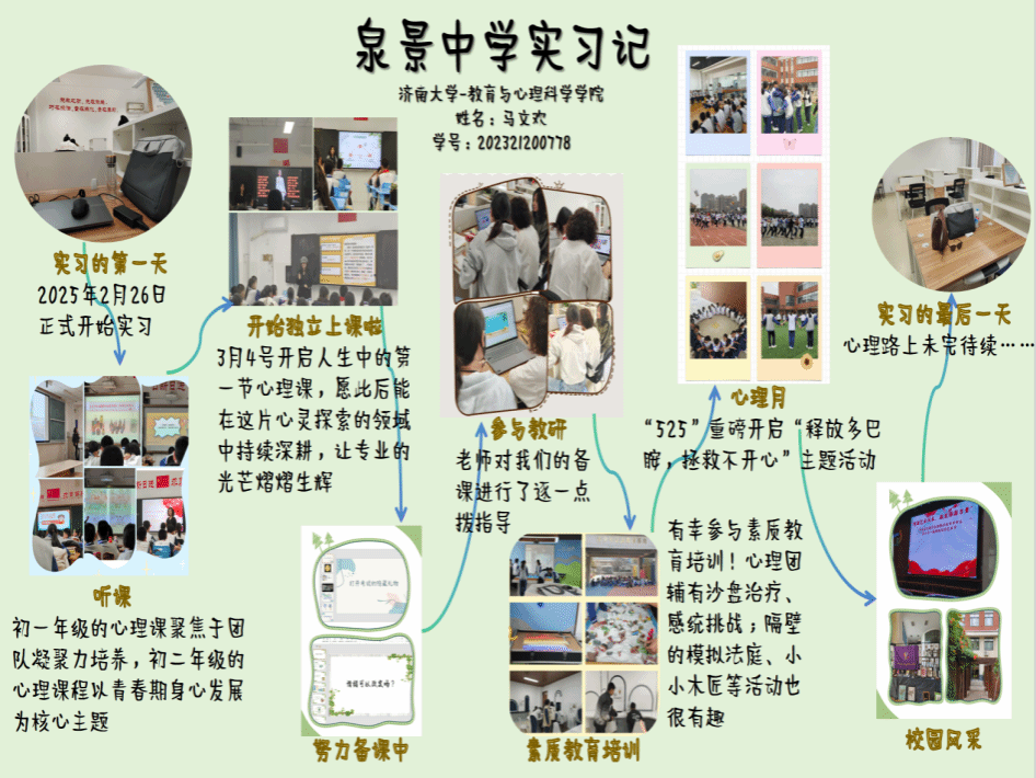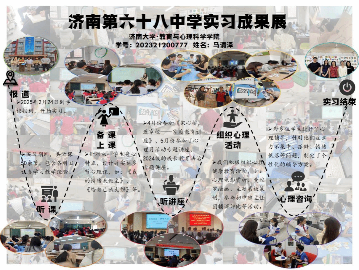 2025年春日,beat365官网2023级的20名心理健康教育领域的研究生怀揣着对教育事业的满腔热忱奔赴山东各地实习。从济南市教研院到莱州金城中学,从济南泉城中学、济南泉海学校到济南泉景中学,从济南十六里河中学、济南第六十八中学到博山五岭路小学,他们严于律己,以身作则,在鲜活且真实的教育场景里,努力蜕变,最终圆满的地完成了从“准教师”到“真教师”的蜕变。这20名研究生坚定地在教育的肥沃土地上扎根,充分利用信息化教学手段,像是给学生课堂注入了活力的催化剂,让其瞬间焕发生机。