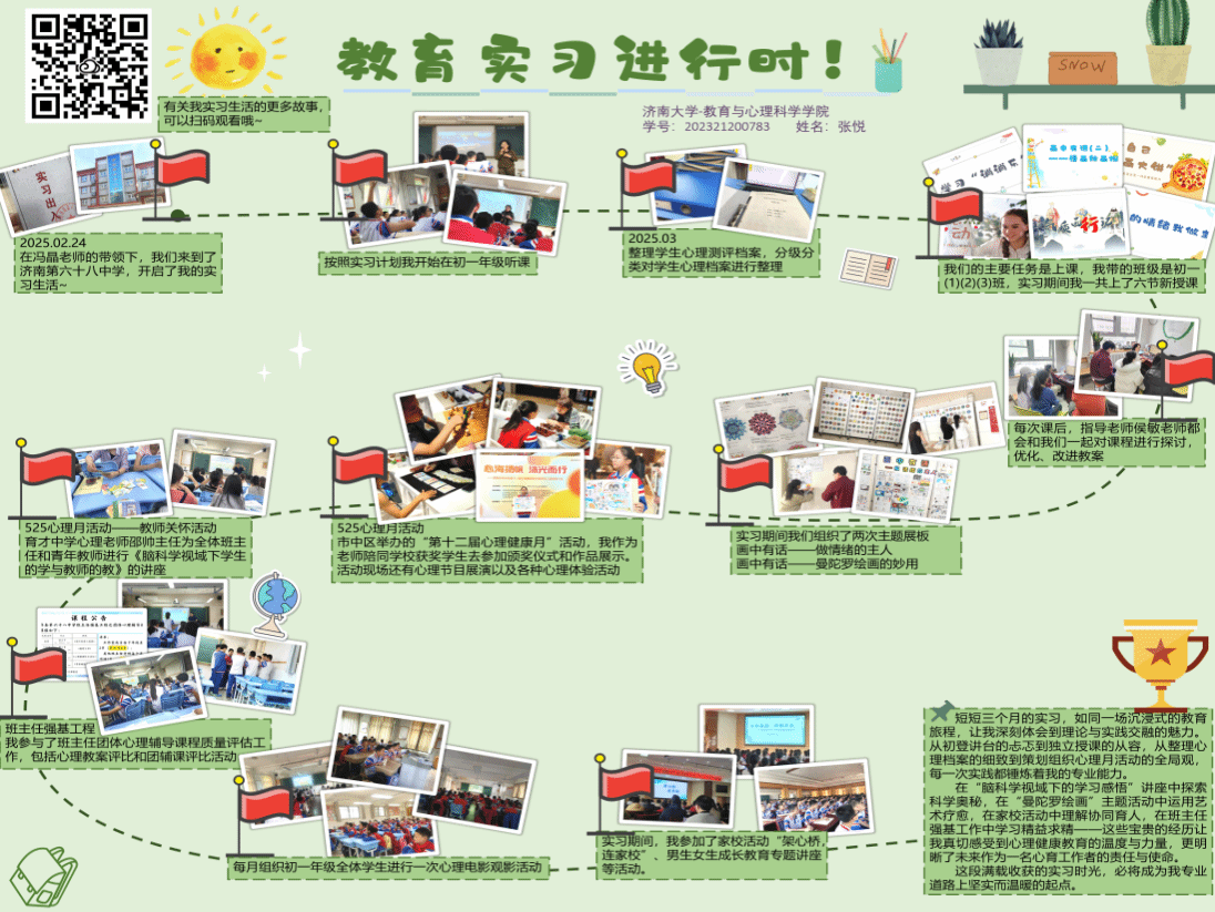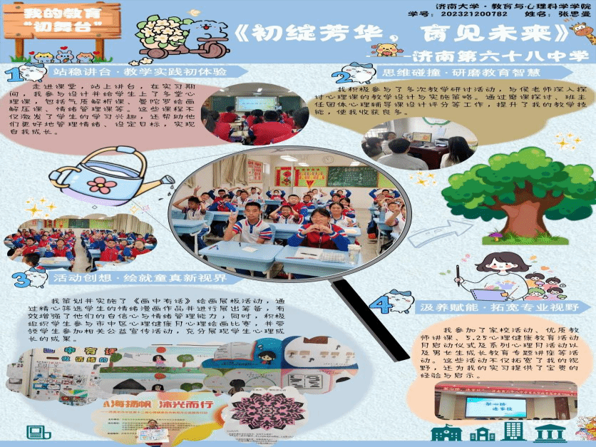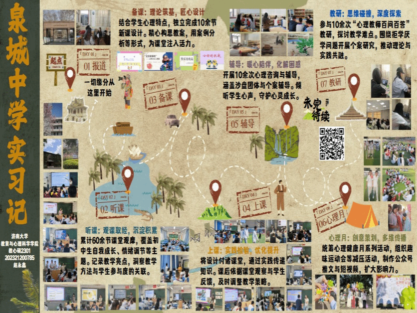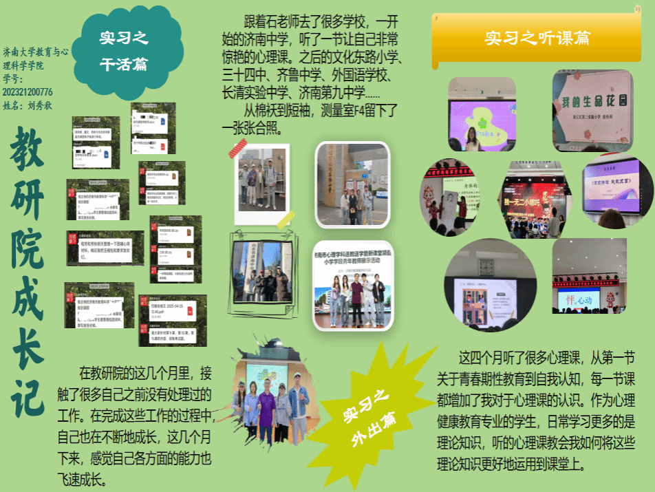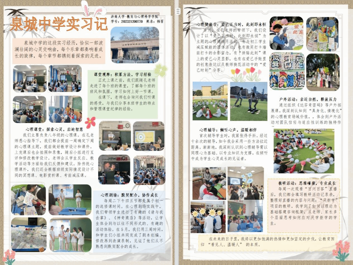 2025年春日,beat365官网2023级的20名心理健康教育领域的研究生怀揣着对教育事业的满腔热忱奔赴山东各地实习。从济南市教研院到莱州金城中学,从济南泉城中学、济南泉海学校到济南泉景中学,从济南十六里河中学、济南第六十八中学到博山五岭路小学,他们严于律己,以身作则,在鲜活且真实的教育场景里,努力蜕变,最终圆满的地完成了从“准教师”到“真教师”的蜕变。这20名研究生坚定地在教育的肥沃土地上扎根,充分利用信息化教学手段,像是给学生课堂注入了活力的催化剂,让其瞬间焕发生机。
