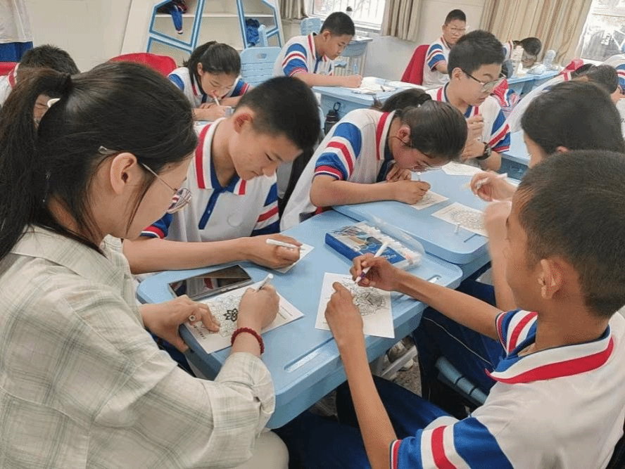 马清泽:在实习期间,我带领学生们进行了一次曼陀罗绘画课程。课堂上,孩子们专注地描绘着心中的图案,每一笔都透露出他们对色彩的感悟和对内心世界的探索。绘画过程中,他们不时与我交流,分享自己的创作灵感和情感体验。我耐心倾听,给予鼓励和指导。通过这次活动,我不仅帮助学生们释放了压力,还加深了我们之间的情感联系,让他们在艺术中找到了自我表达的方式。