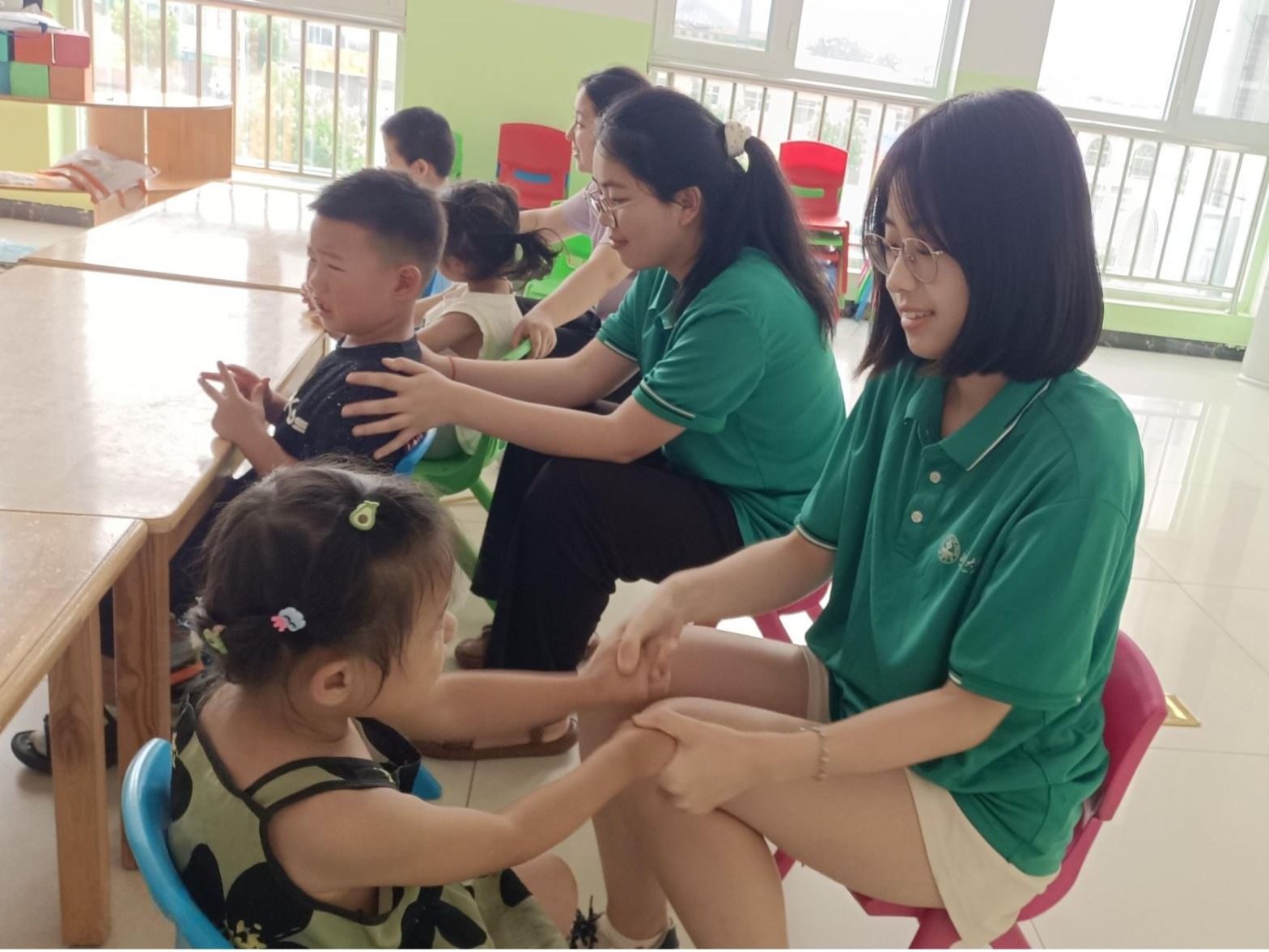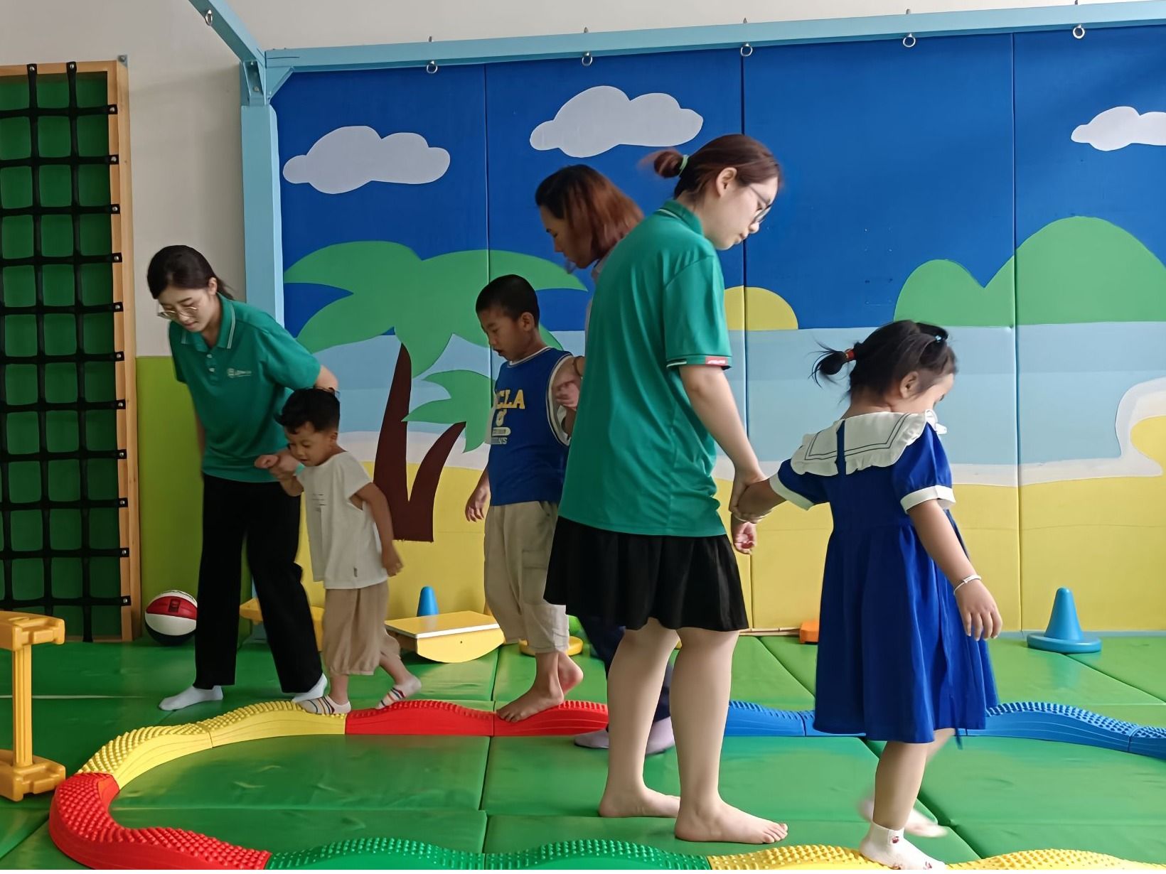 实践活动期间,团队成员同机构中心的老师一起走进班级,与多名特殊儿童进行面对面接触与教导,将专业知识与青春热忱,化作特殊儿童逐光路上的羽翼。教导内容多种多样,如协助老师对特殊儿童进行识字训练、看图识人、朗读汉字等等,训练认知能力与语言能力;又或是辅助孩子们进行攀爬、走平衡木、跨栏杆、随音乐进行舞蹈等运动,增强身体机能与运动能力的发展,同时进一步增强孩子们的注意力,促进情绪与社交发展。此外为进一步与孩子们进行交流与沟通,团队成员还与机构老师、特殊儿童进行了水枪大战,与老师、孩子们一起在一声声欢声笑语中增进感情,让最珍贵的共鸣产生在童趣碰撞的瞬间。活动结束后,机构特地为团队成员举办了欢送会,成为双向滋养的“成长课堂”:成员们用真诚的语言表达出自己在这些天的收获,并对机构的老师与孩子送上自己真挚的祝福;同时,机构也表达出对于学院的感谢与支持,感谢成员们在这些天的辛勤付出,并期望可以再次与教心学院开展合作。