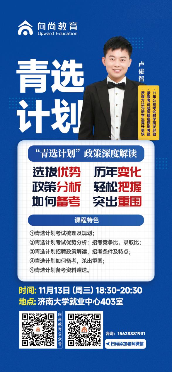本场活动主要是以我校学生备考优势,近几年的考试的考情考况作出详细分析,具体内容包括:①青选计划考试梳理及规划;②青选计划考试优势分析:招考比、竞争比、录取比;③青选计划招聘公告解读,招考条件及特点;④青选计划如何备考,杀出重围;⑤山东普通选调政策变化、早规划、如何备考、轻松上岸,⑥赠送到场同学研发资料+精美文创礼品。