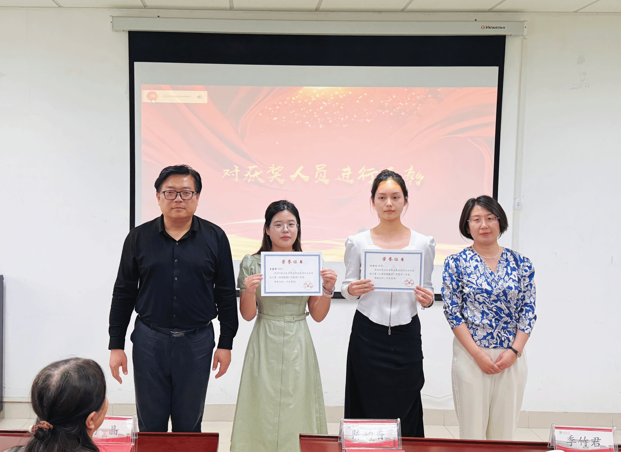 随后,获奖学生依次上台领奖,领导和老师为他们颁发荣誉证书,并合影留念。心理健康教育方向一等奖获得者任佳欣和特殊教育方向一等奖获得者王春晖依次发言,分享备赛心得与成长感悟。她们表达了对学院和老师的感谢,指出团队协作和不断尝试新方法的重要性,鼓励同学们勇于挑战自我,锻炼扎实的从业技能,珍惜每一次站上讲台的机会,因为每一次的课堂实践,都是传授知识、播种希望、唤醒灵魂的宝贵契机。她们坚信,只要大家怀揣对教育的热忱,勇于尝试,不断提升自己的从业技能,定能在教育的航道上乘风破浪,书写属于自己的辉煌篇章。