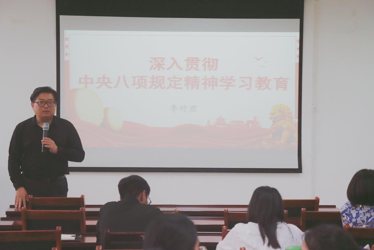 季竹君从中央八项规定出台的背景、重要意义入手,解读了八项规定的具体内容,并结合高校教师的实际情况,通过生动形象的案例,深入剖析了高校教师应当警惕的基本纪律要求。季竹君强调,全体党员干部要提高政治站位,严守党纪,端正学术风气,保持清廉本色,各级党组织要切实发挥引领作用,带头搞好自身学习教育,扛起主体责任;同时,每名党员都应认真学习领会中央八项规定精神,以身作则,防微杜渐,确保中央八项规定精神落到实处。