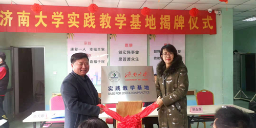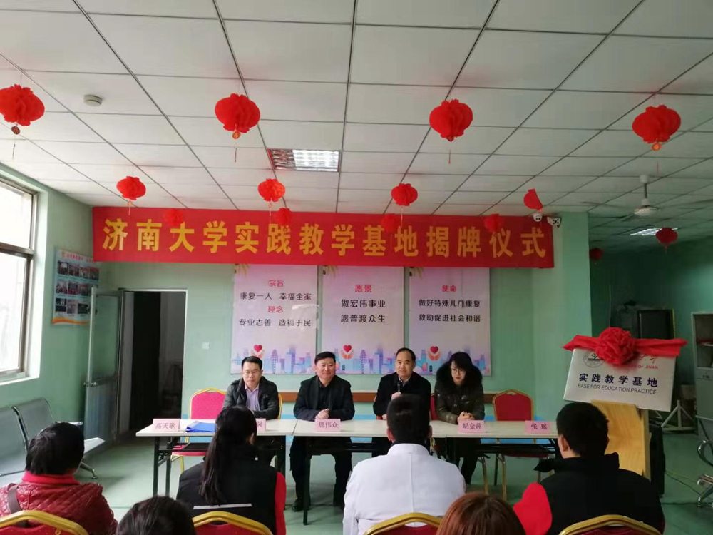 1月13日上午,beat365英国官方网站教育与心理科学学院王本法教授、心理系主任乔福强博士、特殊教育系教师代表胡金萍老师和硕士研究生张瑶、高天歌一行,来到济南市市中区伟众儿童康复中心(以下简称“康复中心”),开展“beat365英国官方网站实践基地挂牌仪式”活动。康复中心负责人唐伟众院长和各位领导、教师20余人参加此次活动。此次活动由伟众儿童康复中心教师主持。