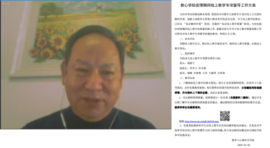 为进一步落实学校教务处和学院党委关于做好确保疫情防控“停课不停教、停课不停学”的整体工作部署、提升教师线上教学能力,2020年3月3日下午2点,教育与心理科学学院全体教师使用QQ群以“屏幕分享+语音+视频”的形式进行了“一周在线课程经验分享”研讨会,此次研讨会是“疫情下在线课程建设”活动之一,是基于对自2月24号开学以来一周线上教学工作的总结,为全院教师提供经验交流的平台。研讨会开始后,杨昭宁院长首先介绍了目前学院在线教学情况,从学院方面对如何保证在线课程的顺利进行做了统一部署。牛瑞斌书记对学院疫情期间的防疫工作做了部署,并希望各位老师能够同时做好疫情防控和在线课程授课。研讨会邀请了8位老师(宋旭红、张素玲、于丽琴、宿淑华、唐本钰、王荣、冯晶、杨鹏)对过去一周在线课程的建设方法与心得进行了分享。林丰勋教授向全体教师解读了学院关于保证在线课程实施的学院督导方案。研讨会由李开云院长助理主持。