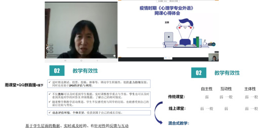 王荣副教授分享了疫情时期《心理学专业外语》网课的心得体会,对比了传统教学和线上教学在“自主性、互动性和主体性”三个方面的优缺点,并提出如何充分利用在线教学来弥补线下教学的不足。王老师提出未来课程要充分将线上与线下教学结合,做到“随时、随地、实时、实地”的呼应与融合。