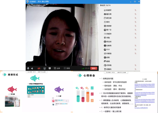 于丽琴教授以QQ语音形式分享了自己上《人格心理学》这门课程中的心得。于教授特别提到线上教学设计的重要性,教学设计要有前测和后测,注重课程目标导向,拆分课程知识点,每一个知识点10分钟左右,并且要重视线上督导以及过程评价等。