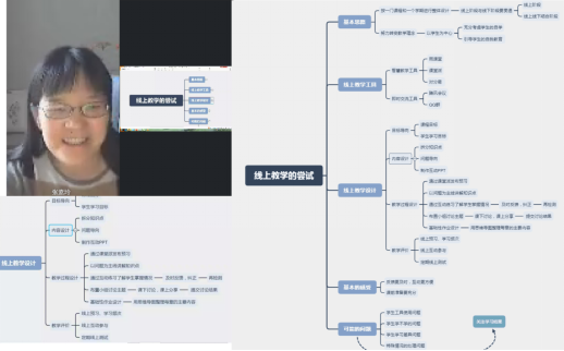 张素玲教授采用思维导图的方式向各位老师分享了在线授课的基本思路、线上教学工具的使用、线上教学设计等,以及目前上课的基本的感受(反馈更及时,互动更方便,课前准备要充分)、目前在线课程存在的可能问题(学生工具使用问题、学生学不学的问题、学生学习差异问题和特殊情况处理问题)等,张教授这种系统有序的梳理使得全院教师更加清楚了解目前在线教学的重点和难点。