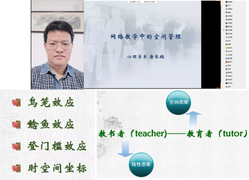 唐本钰副教授以《网络教学中的空间管理》为题,提出如何利用教育学与心理学中“鸟笼效应、鲶鱼效应”“登门槛效应”和“建立时空间坐标”四个方面提高在线教学的效果和质量,建立网络教学的生态空间。