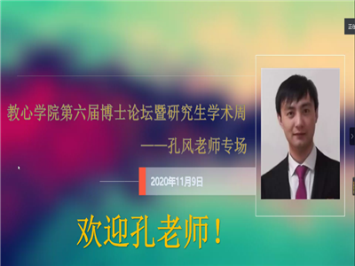 为推进学院科研工作进一步开展,促进研究生科研能力和科研素养的提升,2020年11月9日,教育与心理科学学院成功举办第六届博士论坛暨研究生学术周第一期论坛,本次论坛邀请陕西师范大学心理学院副教授、硕士生导师孔风做线上科研经验分享,由副院长陈功香教授与王树青教授共同主持,学院20级全体研究生及部分教师参加了此次论坛。