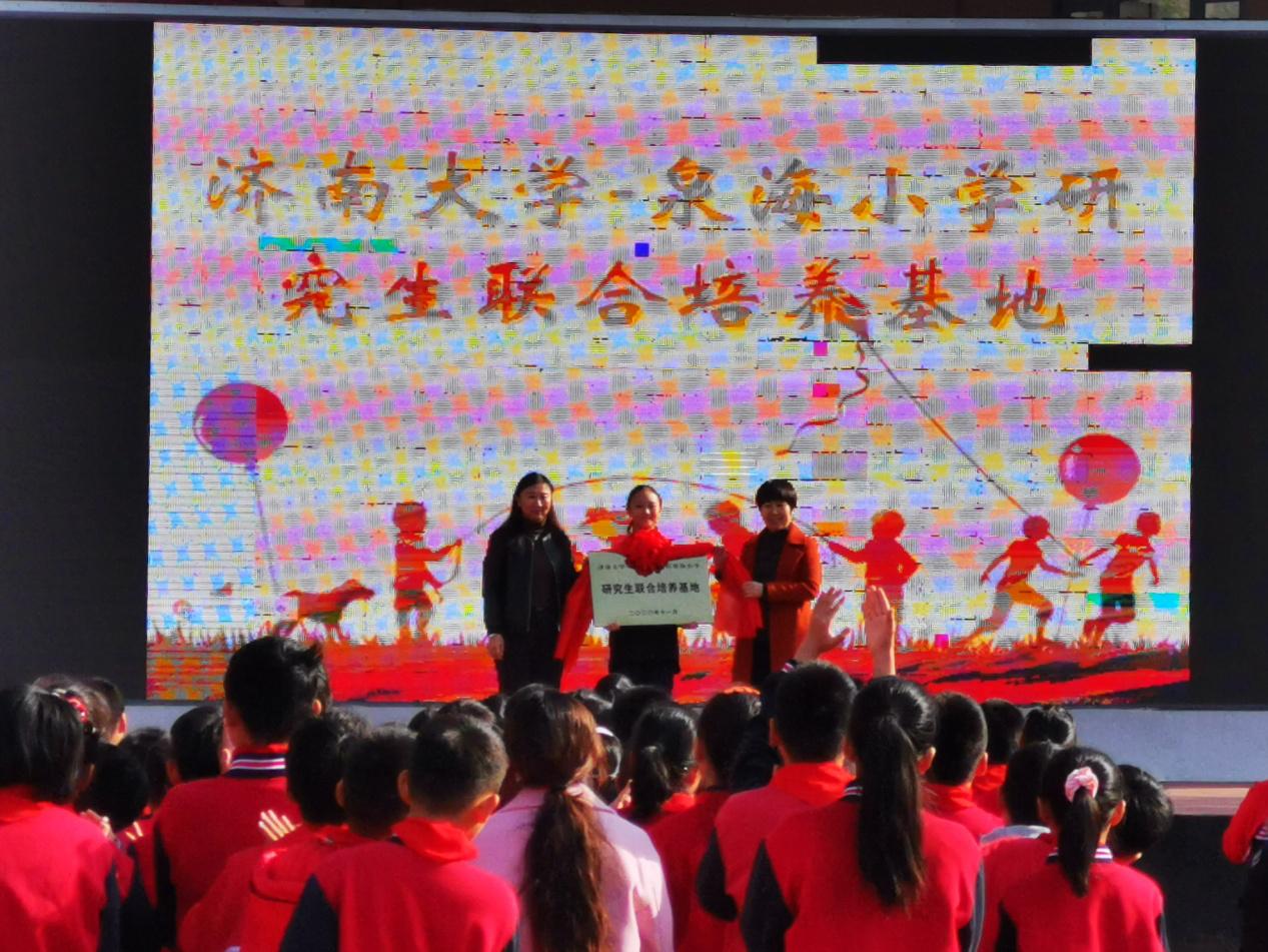 11月6日上午,beat365英国官方网站与济南市市中区泉海小学共建校外研究生联合培养基地揭牌仪式暨校外研究生导师聘任仪式在济南市市中区泉海小学隆重举行。济南市市中区泉海小学校长于泉,beat365英国官方网站研究生院副院长仲倩、beat365英国官方网站教育与心理科学学院副院长陈功香、教育与心理科学学院部分导师、研究生代表以及泉海小学全体师生参加了仪式。