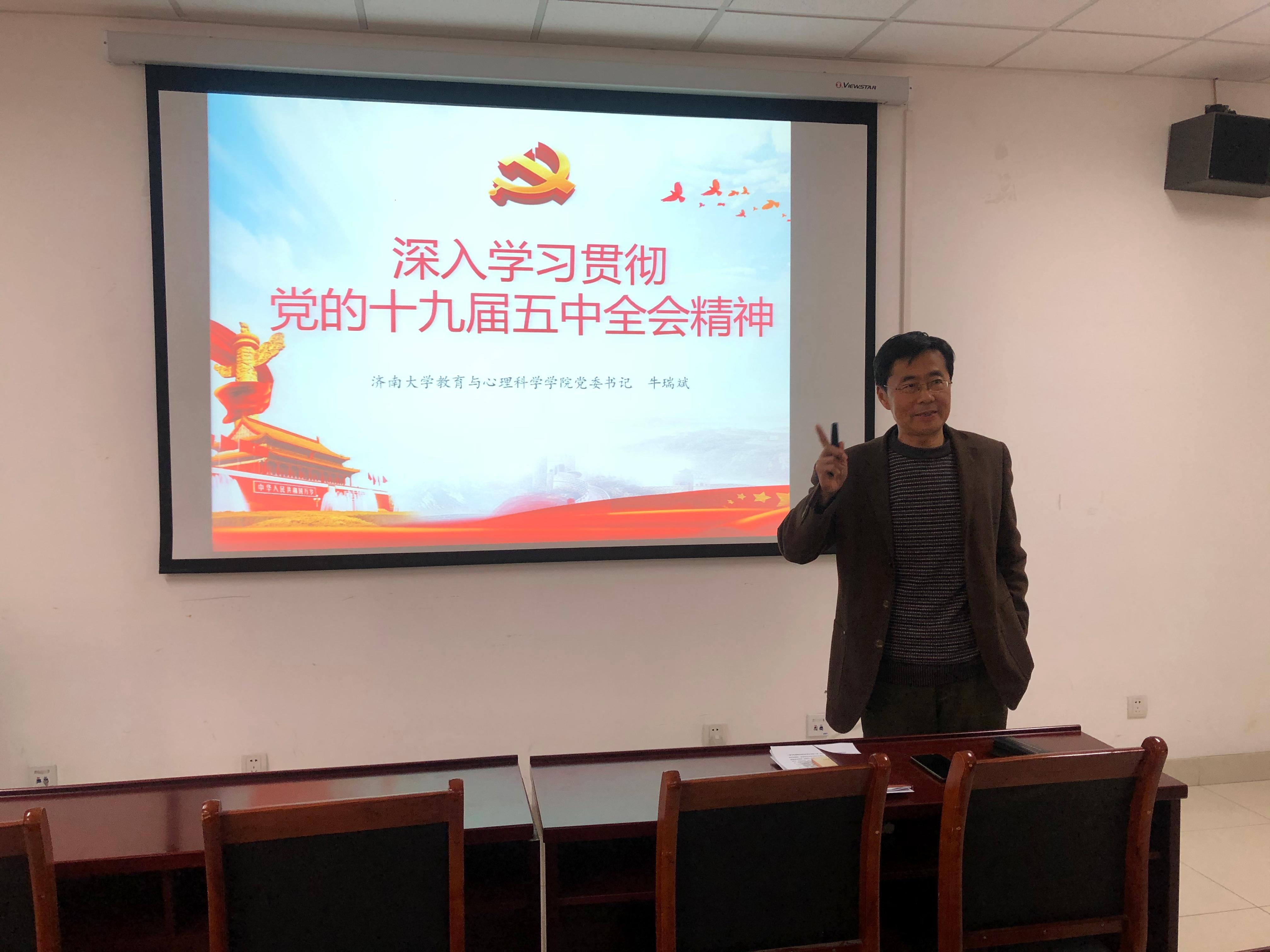 12月15日,教育与心理科学学院组织全体教职工集体学习,学院党委书记牛瑞斌进行了深入学习贯彻党的十九届五中全会精神专题党课。