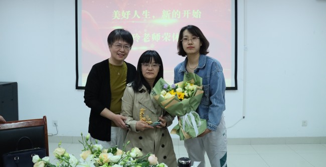 郑宇红、胡金萍老师代表学院向张素玲教授赠送学院荣休纪念品并献花
