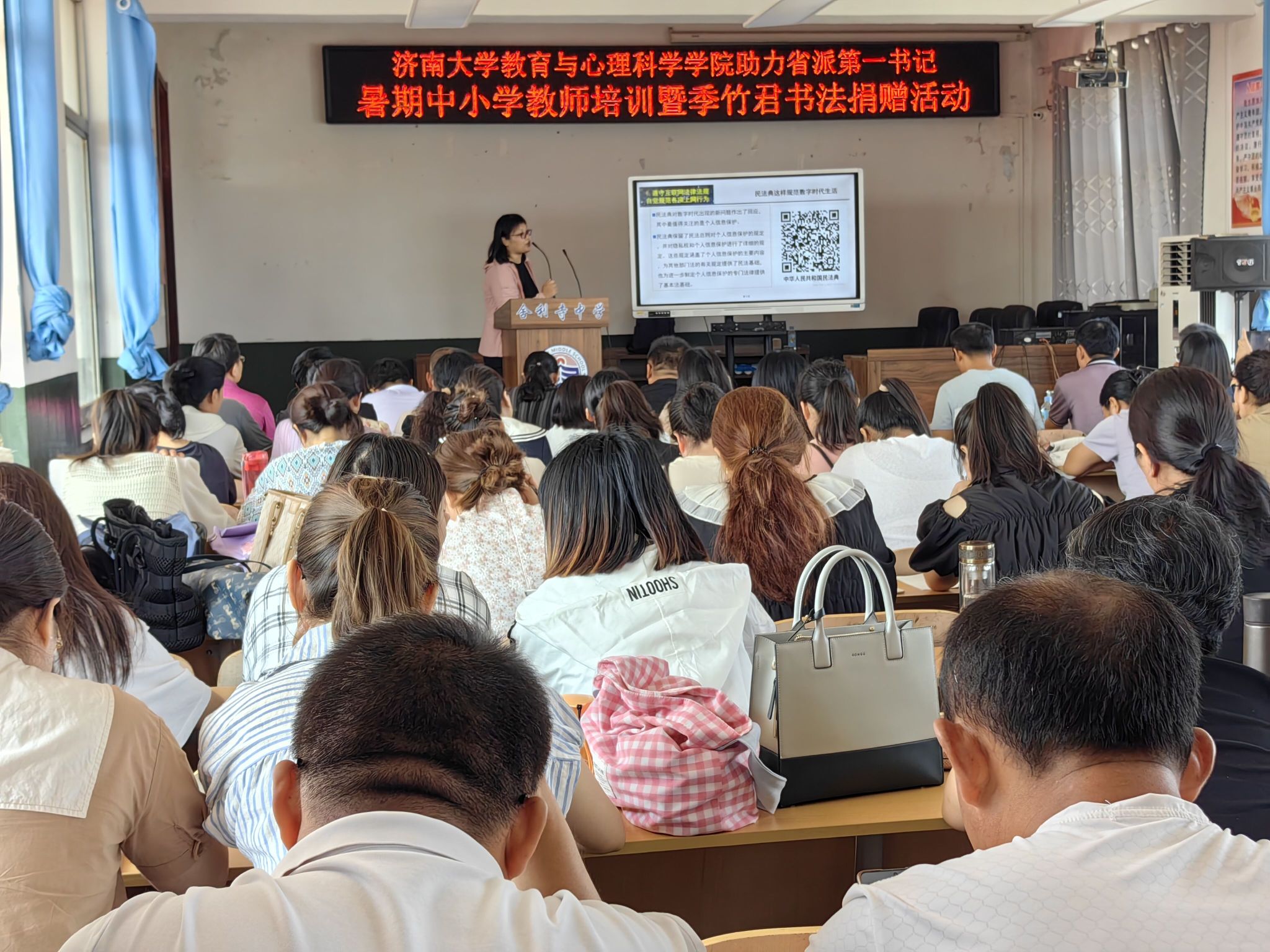 讲座开始前,学院党委书记季竹君为古城镇中学、舍利寺中学和镇中心小学进行了书法捐赠,遒劲有力的书法作品表达了对古城镇教育事业的真诚祝愿和美好期盼。