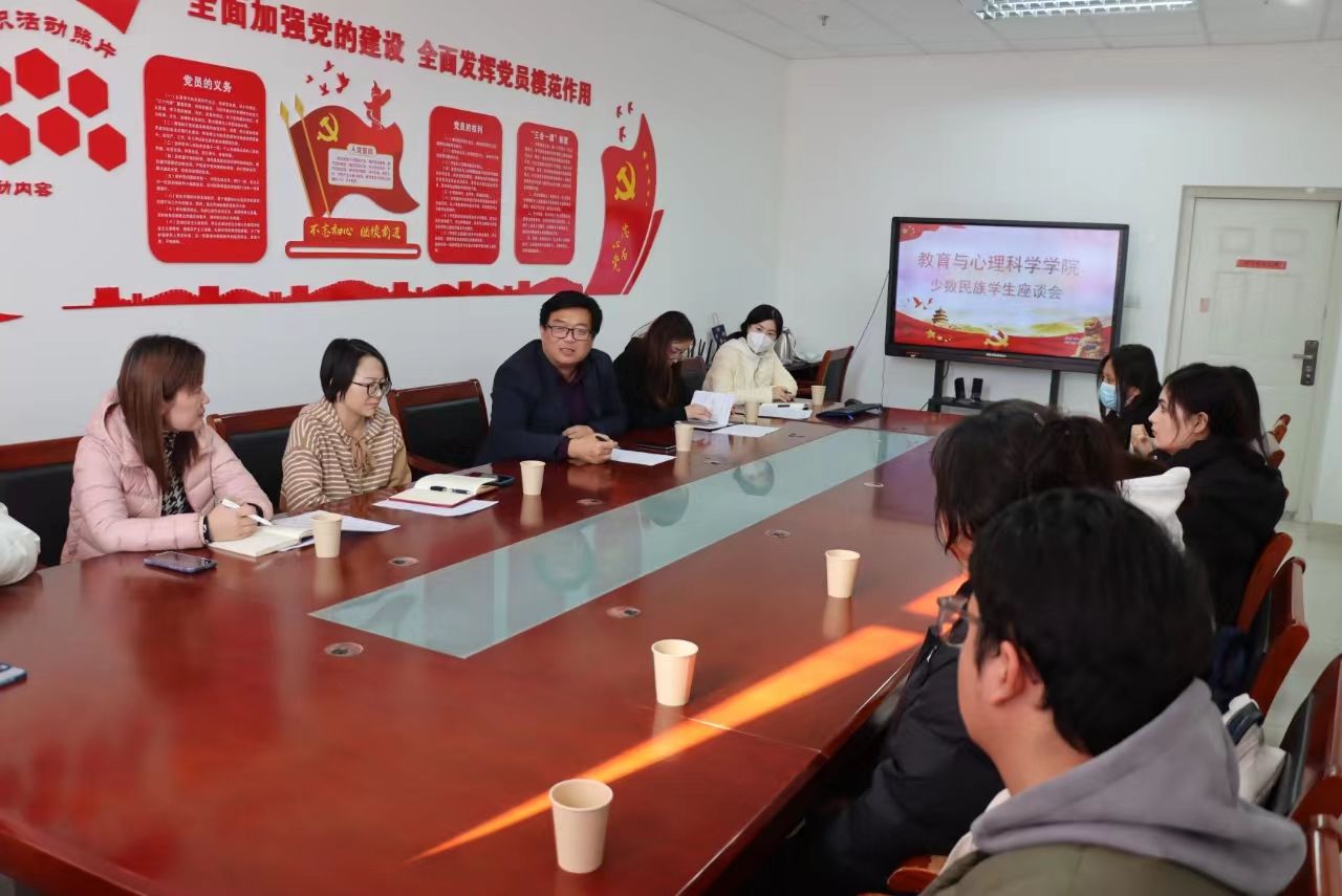 为贯彻落实习近平总书记关于加强和改进民族工作的重要思想,进一步引导学院学生铸牢中华民族共同体意识,11月30日,教育与心理科学学院于特教楼A315召开少数民族学生座谈会。学院党委书记季竹君,学办主任、团委书记卓华丽,辅导员刘晓彤、曹丽丽及少数民族辅导员买地阿依·阿布都古力与少数民族学生代表参加此次会议。会议由买地阿依·阿布都古力老师主持。