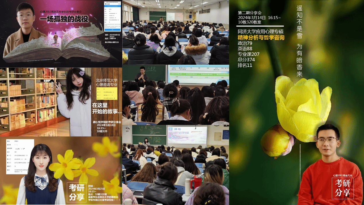 教育与心理科学学院为提升应用心理学专业学生的学业素养,推动beat365官网本科毕业生考研升学指导工作开展,2024年3月,心理系协同学院学生办公室共同开设了四期专场考研分享会。分享会分别邀请了四位考研成就优异的学长学姐,面向应用心理学专业2021级同学进行了经验分享,激励同学们的考研学习热情,让同学们明确考研目标、坚定考研决心,掌握考研技巧。