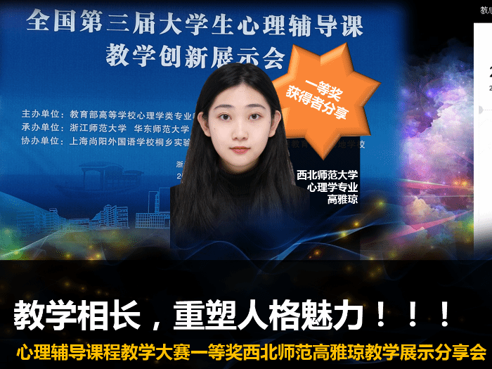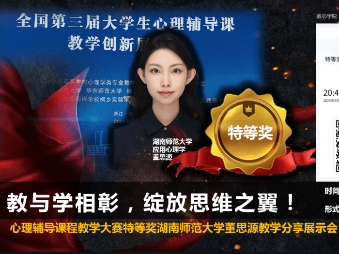 为增进同学们对心理辅导课程的了解,营造积极向上的心理文化氛围,教育与心理科学学院于4月28-29日举办教心学院 “滋兰”育心计划系列讲座 “心理辅导课程教学大赛特等奖、一等奖教学分享展示”活动。
