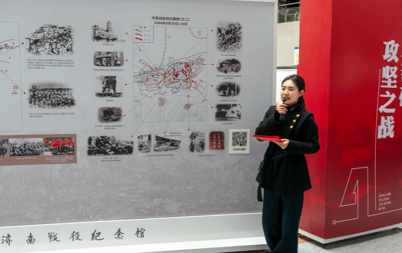 “作为济南战役史实展讲解员,我常常与展板相伴,心中满是跨越时空的震撼与沉甸甸的使命。从‘伟大胜利,历史坐标’到‘英雄山上,永恒丰碑’,每一张老照片,每一个动人的故事都在诉说着1948年那场开创先河的城市攻坚战。带领观众驻足济南战役战线图,看着一条条战线紧密配合,直击济南城,仿佛能触摸到炮火硝烟中的赤诚与无畏,这种身临其境的震撼,让每一次讲解都成为心灵的洗礼。战争硝烟虽已远去,但革命精神永不褪色。作为新时代青年,我们应以永不停歇的奋斗姿态、矢志不渝的如磐信念,在民族复兴的伟大征程中续写新的荣光。在未来我将继续将战争故事,革命精神讲给大家听。”