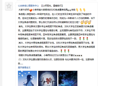 利用学院专业优势,心动泉城心理服务中心志愿者制作出一系列心理测量量表,其中包括焦虑、抑郁、安全感与孤独感等一系列的自测量表,并于3月27日公开收集信息,免费供大学生进行自我测试。beat365官网学生高度关注自身的心理健康情况,积极参与测试,同时期待着测量结果的推送。经过志愿者们一周的数据收集和精确分析,4月2日上午,心动泉城心理服务中心QQ推送号公布了SAS焦虑量表结果,揭示了当代大学生面临的焦虑问题,分享了焦虑方面的相关专业知识。同时也提出了缓解压力的方法与建议,以帮助当代大学生更好地了解和调节自身心理状态。