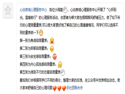居家疫情防控期间,为了帮助大学生更好地了解自己的心理健康情况,舒缓居家期间压力,促进大学生心理健康发展,教育与心理科学学院的心动泉城心理服务中心开展了“心怀阳光、温暖前行”的心理服务活动。