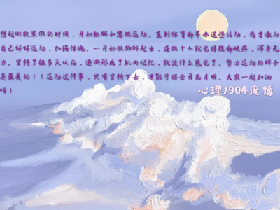 随着新型冠状病毒感染的肺炎疫情不断蔓延发酵,外出锻炼变成了一件“奢侈的事情”。同学们外出时间大大减少,身材也有些不受控制。在这次活动中,教心学子们纷纷加入群聊,分享自己的运动成果,晒出自己的“最美运动瞬间”。有的同学在公园散步,感受微风拂面的温柔;有的同学在家中练习仰卧起坐,感受多巴胺分泌的快感;亦有的同学在灯火中夜跑,感受夜晚星空的陪伴……同学们在晒出自己运动瞬间的同时还分享了自己的运动心得,更是让我们感受到身为青年人的生机勃勃。