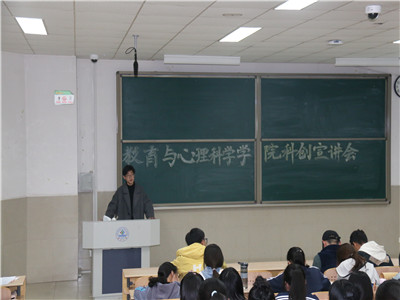 为了增加教育与心理科学学院大一新生对科创活动的了解,调动学生对科创赛事的积极性,提升科创影响力和吸引力,营造良好的科研氛围,教育与心理科学学院于10月26日晚七点在11教5段201举办了科创赛事宣讲会。本次宣讲会由教育与心理科学学院学生会承办。